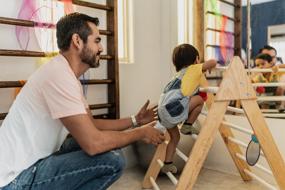Im Bewegungsraum können Kinder sich frei bewegen, spielen und mit anderen Kindern interagieren. In ihrem eigenen Tempo erkunden sie die Umgebung und erweitern ihre Fähigkeiten.